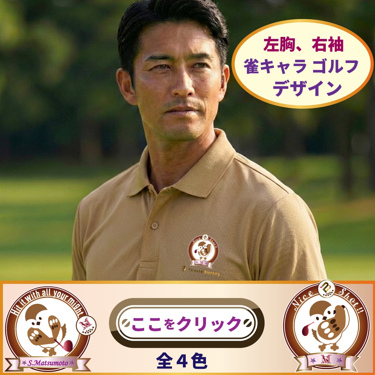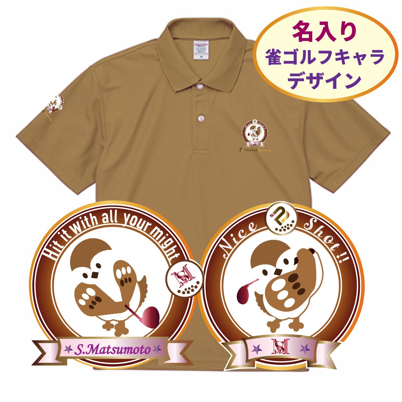 男性用雀ゴルフキャラ(チュン太) サンドカーキ色ポロシャツ(名前、イニシャル入り)