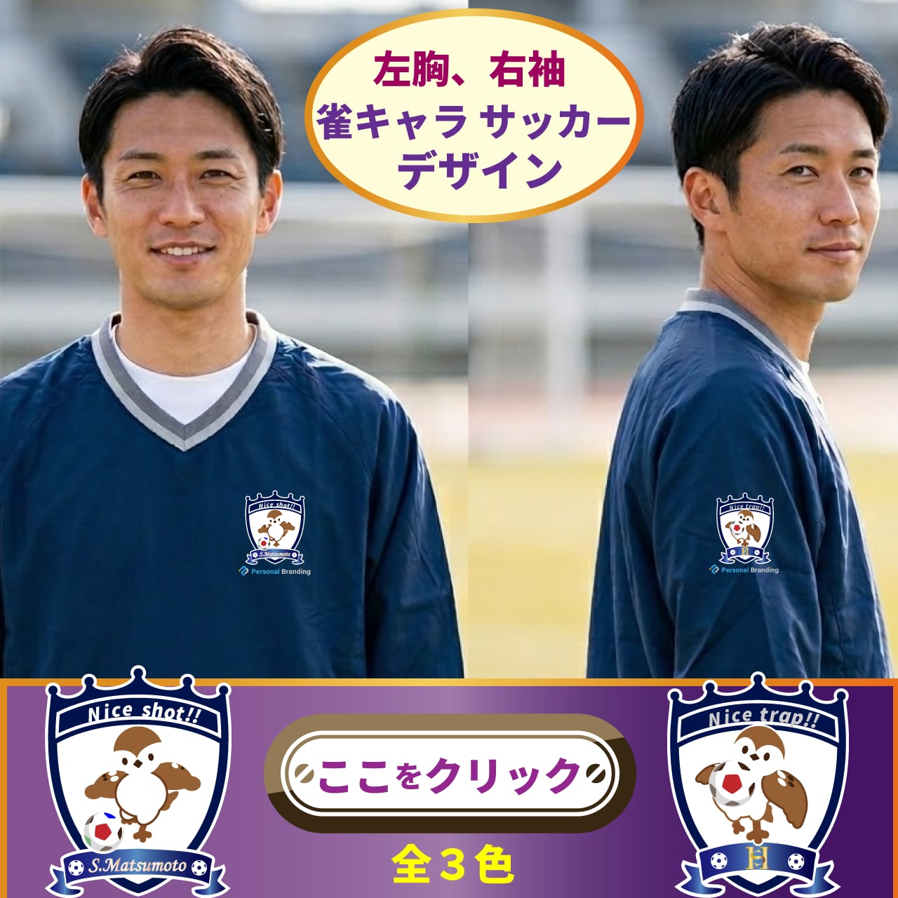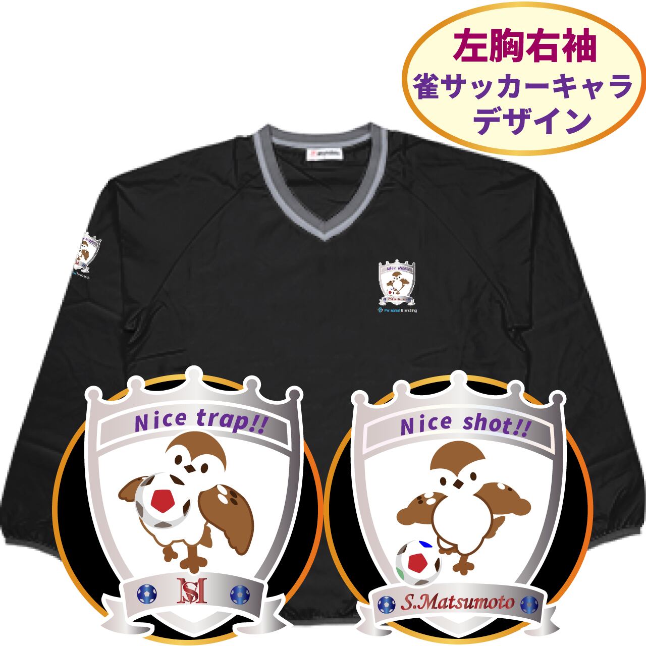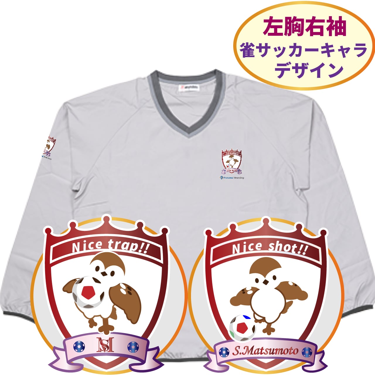 左胸には、「サッカーをする可愛らしい雀のチュン太」