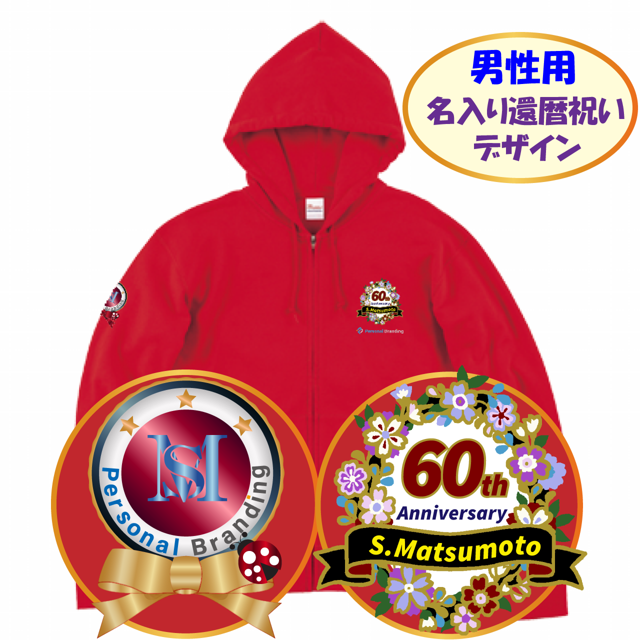 還暦祝い用赤パーカー(お名前、イニシャル入り)
