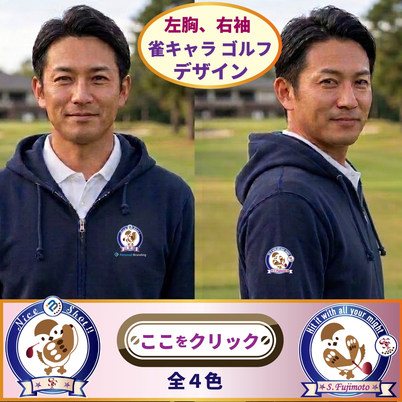 左胸には、「ゴルフをする可愛らしい雀のチュン太」