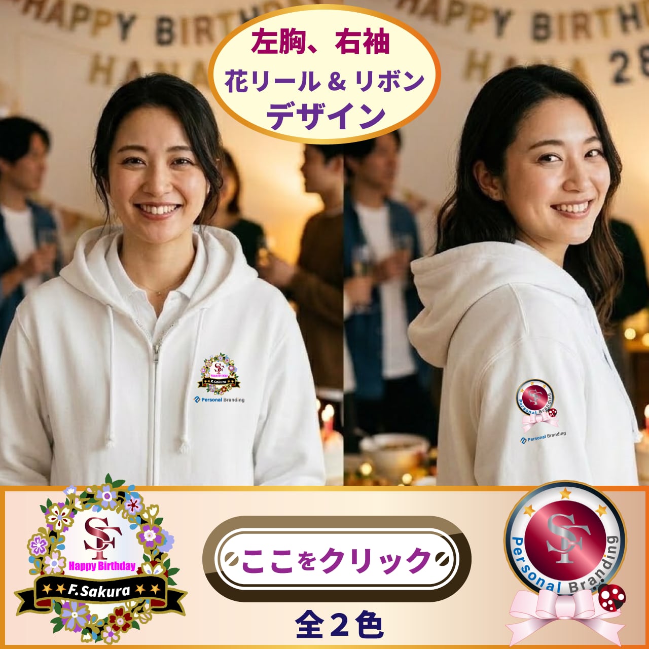 誕生祝用花リール白パーカー(お名前、イニシャル入り)