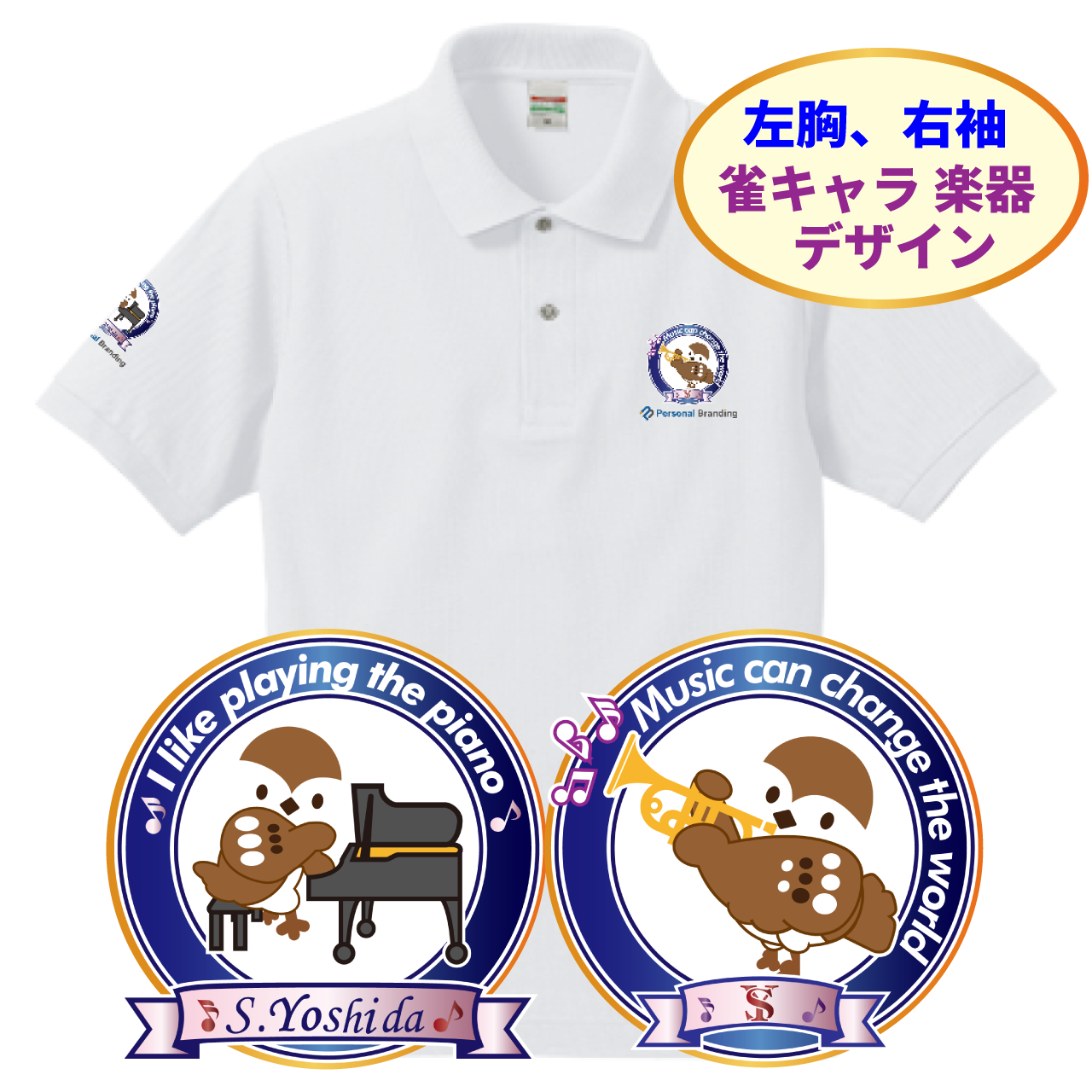 雀キャラ楽器デザインポロシャツ全4色(お名前、イニシャル入り)